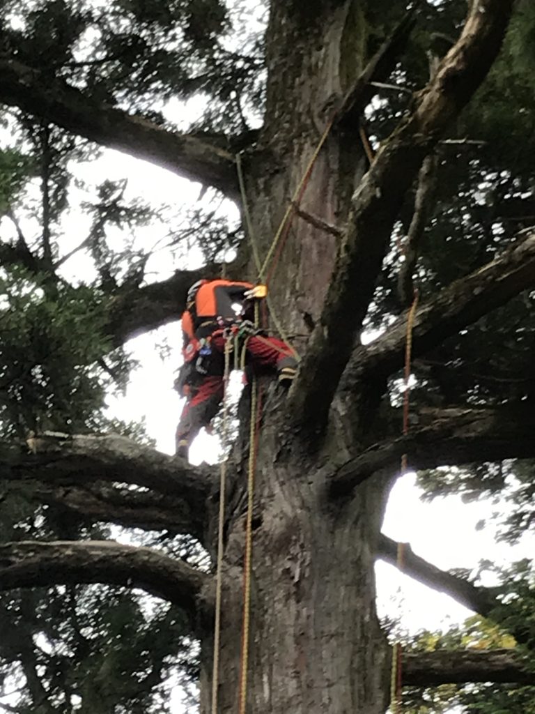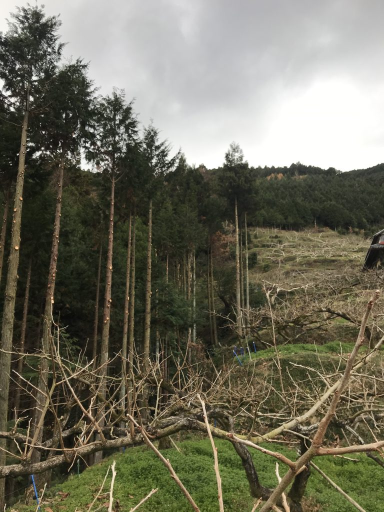 樹と自分の身体をロープで繋いでいるので、一度樹に登るとのぼりっぱなしです。水分もあまり摂らず作業をします。風に一日中あたりっぱなしで身体は冷え切ります。途中昼休憩に暖かい飲み物を用意してくださり温まってからまた作業を再開します。何日間かかけて無事に3本の樹を切りました。